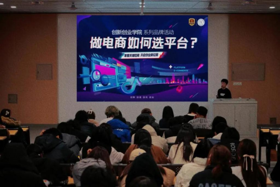 在电商直播知识分享讲座中,专职创业导师围绕电商行业发展趋势、电商平台种类规则、产品如何选择平台等内容进行讲解,并就运营推广、直播带货等技术环节进行辅导。通过理论知识与实际案例的有机融合,不仅加深了同学们对电商行业的了解,也明确了他们在电商直播领域的创业方向。