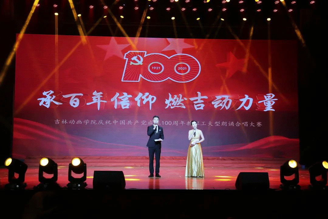 “春风携来流传百年的革命史诗,夏阳普照滋养百年的革命土壤,秋叶知落铺就百年的革命辉煌,冬雪纷飞萤尘百年的革命荣光”“ 这是英雄的祖国 是我生长的地方,在这片古老的土地上 到处都有青春的力量……”漫画学院、游戏学院、虚拟现实学院漫游虚拟世界队的诗朗诵《辉煌画卷映河山》,体现中国共产党百年奋斗光辉历程,再现党团结带领各族人民开辟了伟大道路,建立了伟大功业,铸就了伟大精神。大合唱使教职员工在歌声中感悟我党始终不渝为人民的初心宗旨,汲取奋斗百年路、启航新征程的磅礴力量。