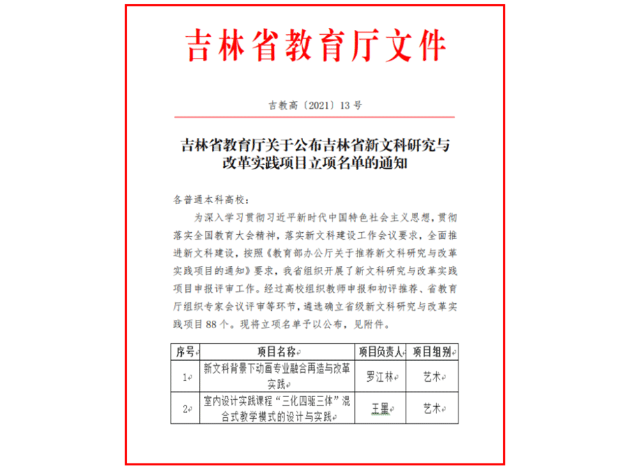 近日,吉林省教育厅公布了吉林省新文科研究与改革实践项目立项结果,万象城官网申报的《新文科背景下动画专业融合再造与改革实践》、《室内设计实践课程“三化四驱三体”混合式教学模式的设计与实践》2个项目成功获批立项,其中由罗江林副校长主持的《新文科背景下动画专业融合再造与改革实践》已入选为推荐教育部的20个项目之一。