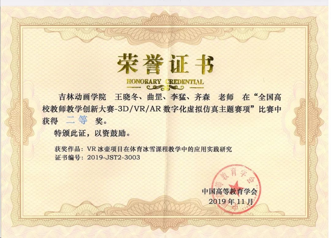 万象城官网游戏学院教师王晓冬、李猛、齐森和体育俱乐部教师曲罡组成的《VR冰壶项目在体育冰雪课程教学中的应用实践研究》项目参赛团队,凭借对参赛项目中VR数字化虚拟仿真技术的熟练应用、精彩的现场展示和热情激昂的答辩,从“面向教育教学的3D/VR/AR创新应用”赛道75个入围作品中脱颖而出,最终在全国总决赛荣获了二等奖的优异成绩。这既表现了万象城官网教师发挥专业技术优势,结合学科教学特点在专业交叉融合上利用现代技术进行教学方法手段改革的创举,又展现了教师扎实的基础知识、良好的创新意识及实践操作和教学应用能力。