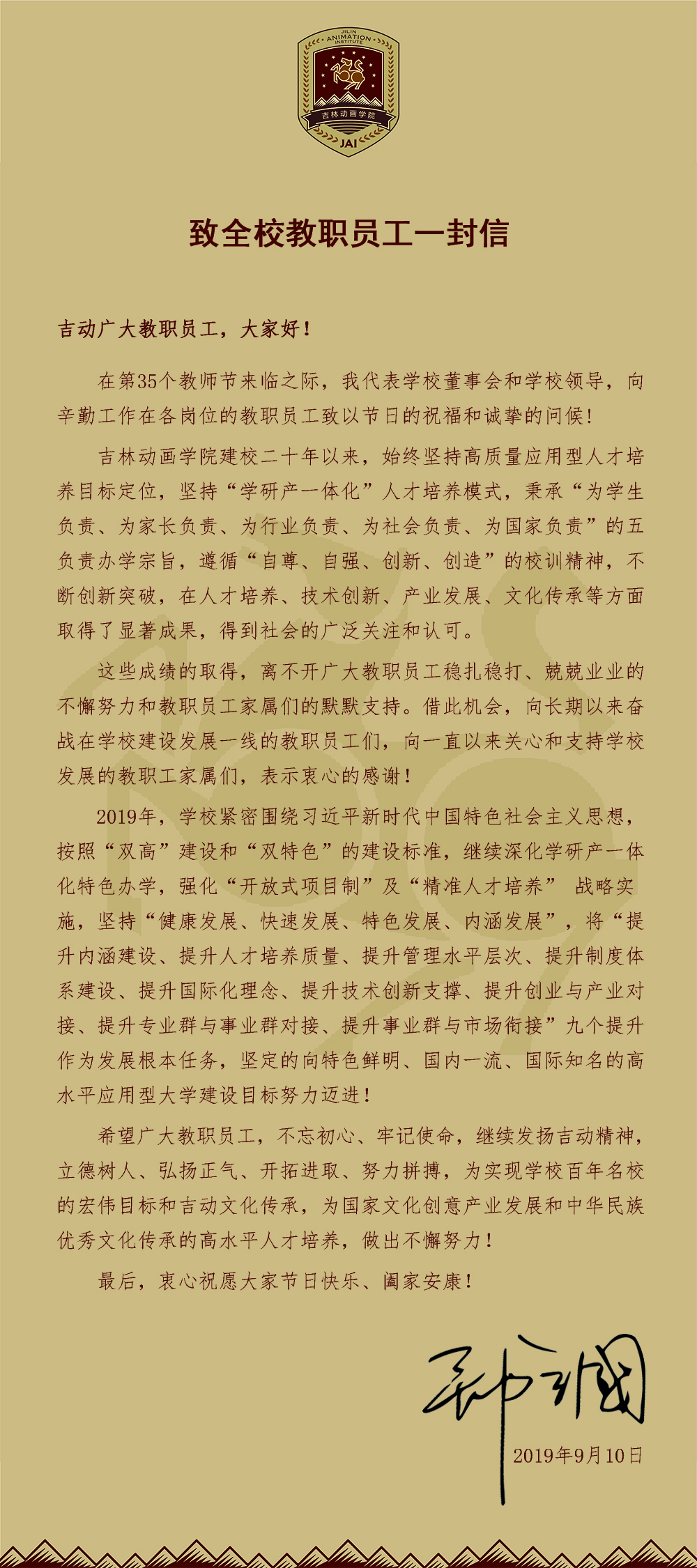 【吉动·致教员】万象城awc官网登录入口董事长、校长郑立国致全校教职员工一封信