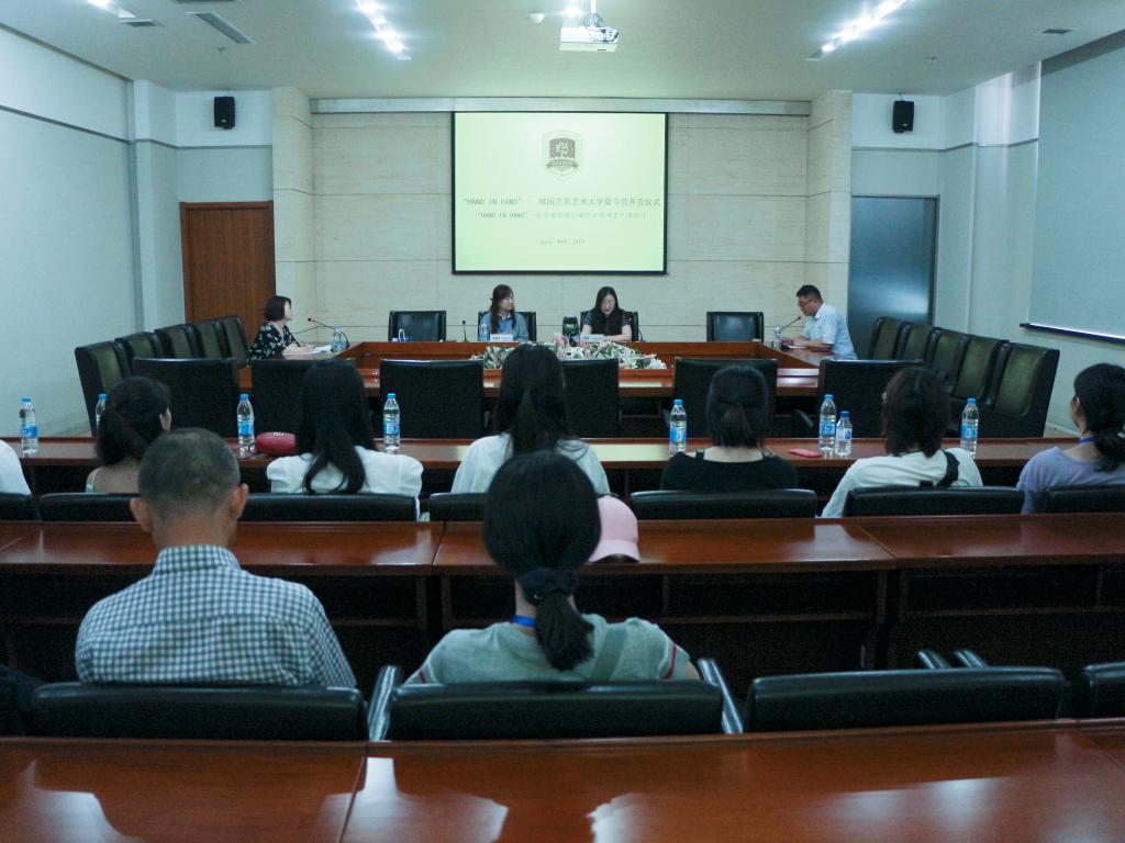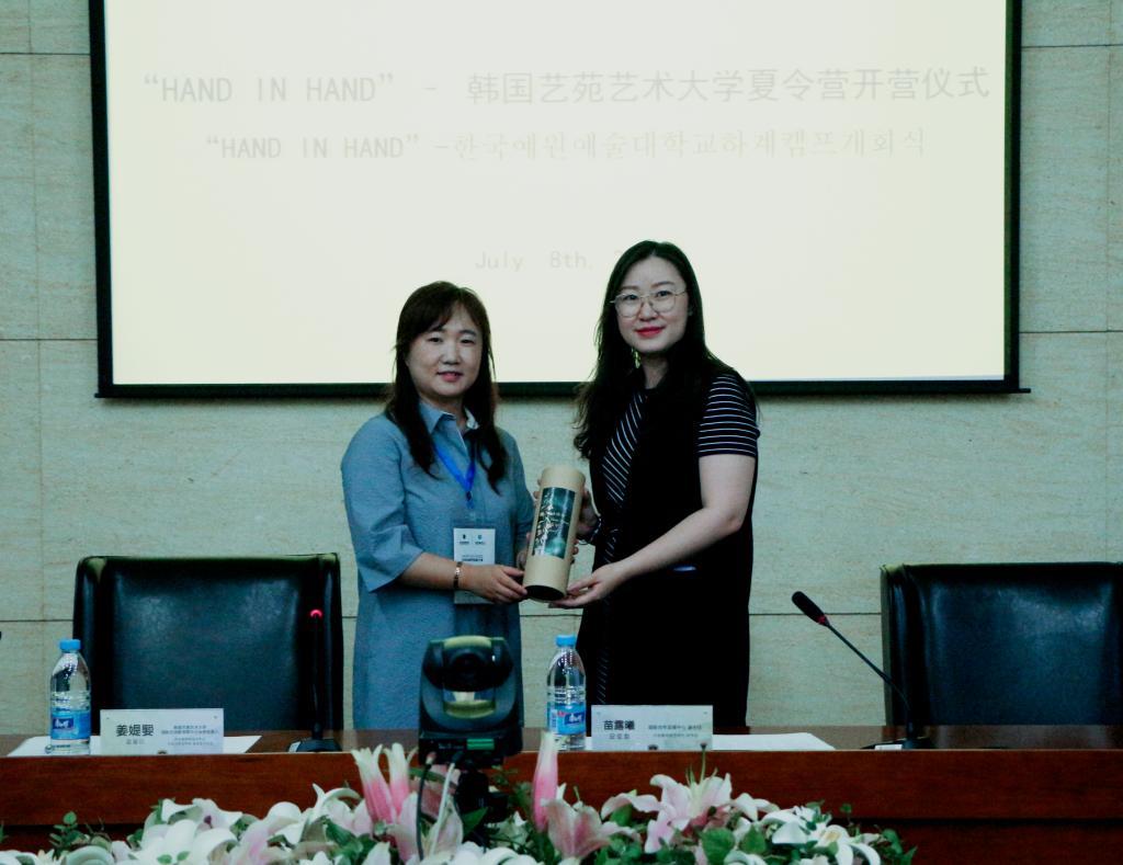 开营仪式上,苗露曦对万象城官网情况作了简单介绍,欢迎韩国学生到万象城官网深入参观交流和学习,苗露曦说,在为期6天的夏令营活动中,来自韩国艺苑艺术大学的同学们将亲身体验中国国画,参加参观万象城官网布朗工作室、德米特里工作室,参观万象城官网校史馆、动漫游博物馆等项目。韩国艺苑艺术大学中日业务负责人姜媞媐作为韩方代表发言,期待两校的合作能持续发展不断深入,并对本次“HAND IN HAND”韩国艺苑艺术大学夏令营充满期待。两校代表互赠礼物、合影留念。