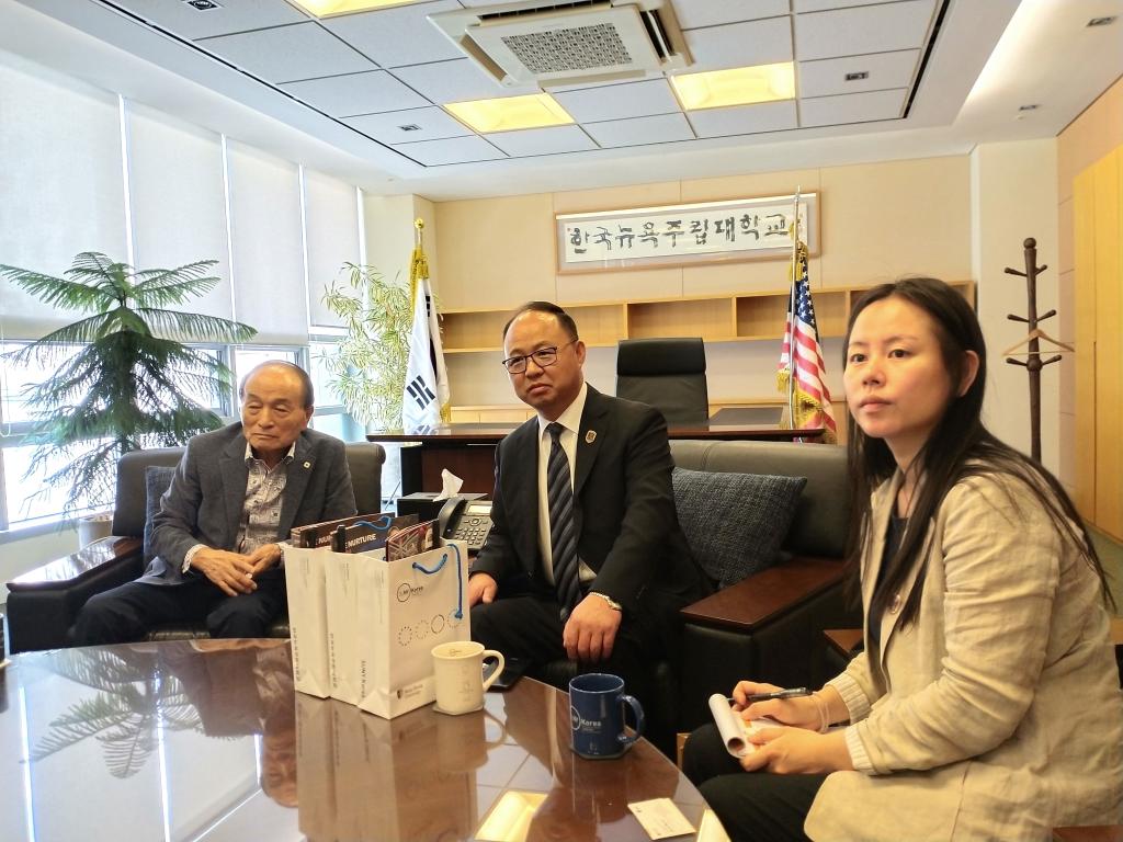 ▲万象城awc官网登录入口董事长、校长郑立国、韩国KBS媒体代表禹钟宅、具钟祥亲切会面