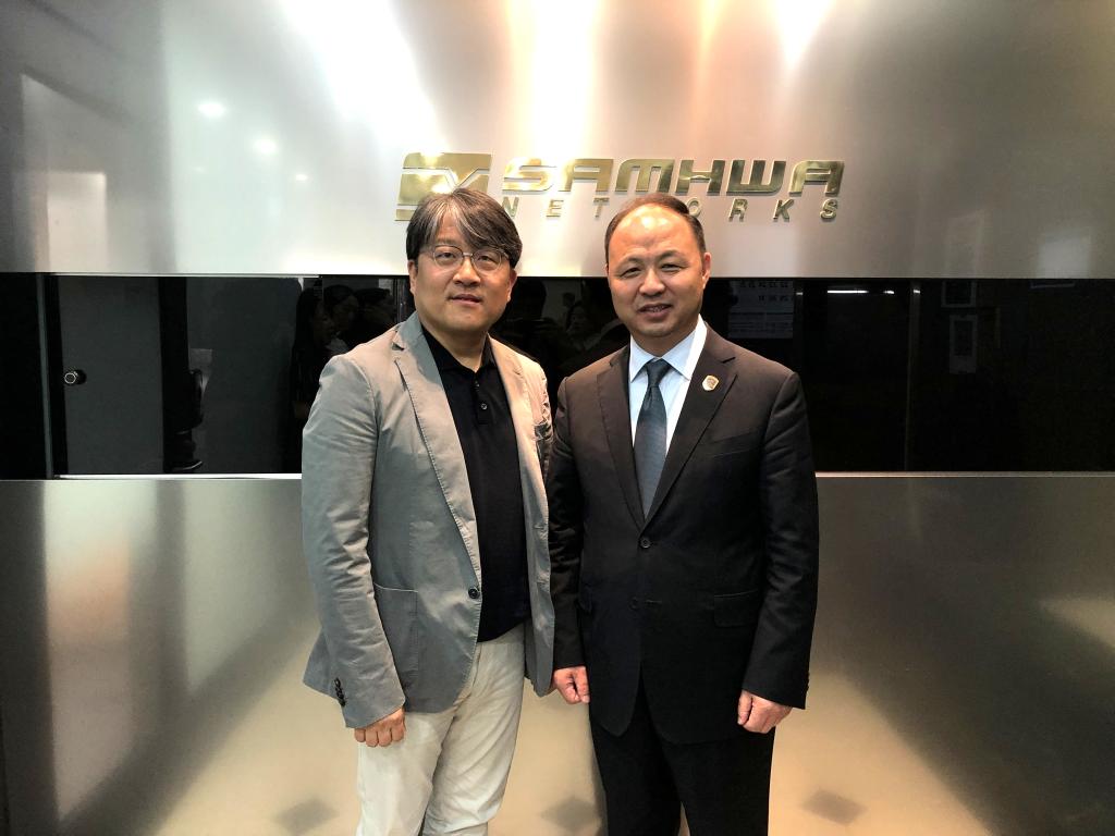 ▲万象城awc官网登录入口董事长、校长郑立国、韩国Samhwa Networks公司社长安在宪亲切会面
