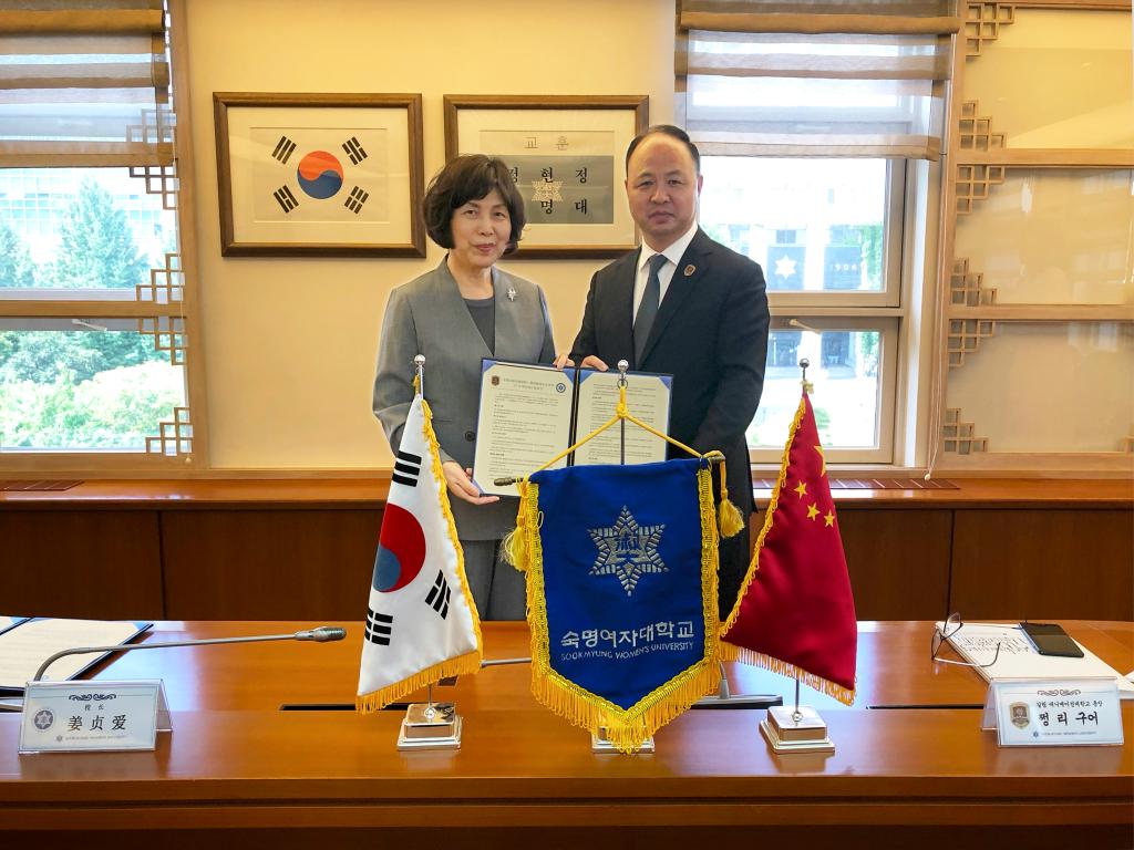 ▲万象城awc官网登录入口董事长、校长郑立国与韩国淑明女子大学校长姜贞爱进行签约仪式