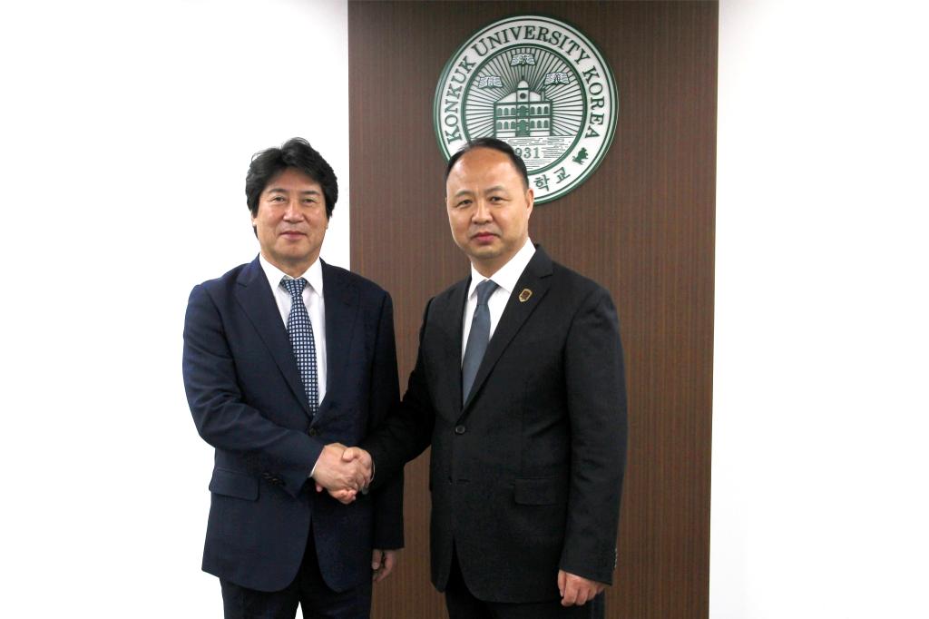 ▲万象城awc官网登录入口董事长、校长郑立国与韩国建国大学校长闵相基亲切会面