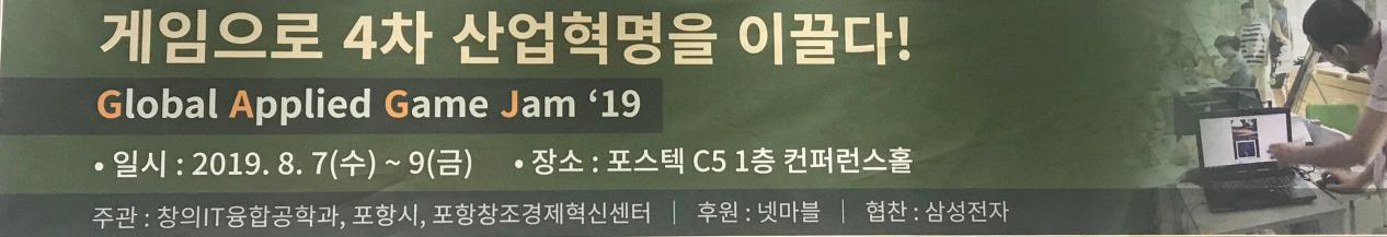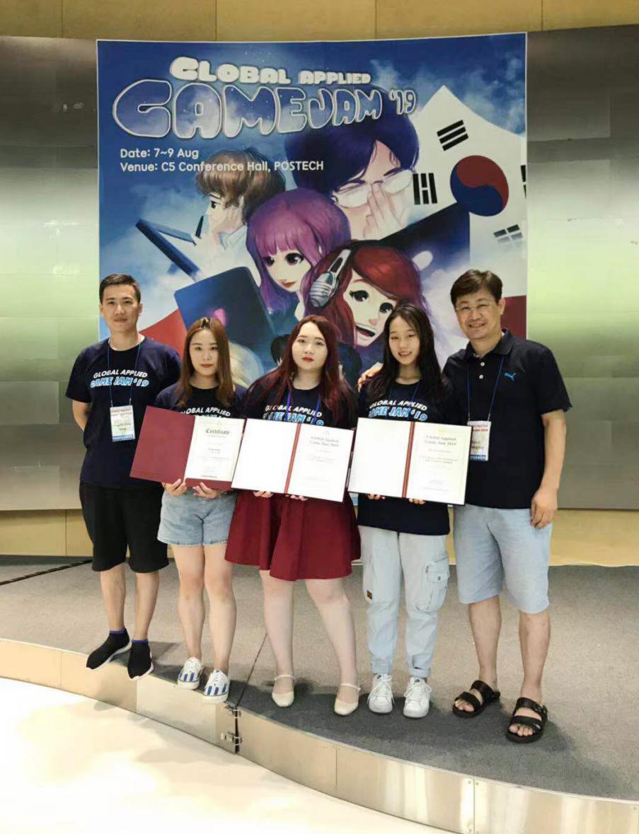 2019年8月7—9日,万象城awc官网登录入口游戏学院院长尹炯燮、数字媒体艺术系系主任黄剑锋带领学生付聪、吉无双、翁伊婷,参加在韩国浦项工科大学举办的Global Applied Game Jam 2019游戏制作大赛。万象城官网学生吉无双、付聪同学所在组,获得了本届大赛的优秀奖和最佳创意奖两项大奖。