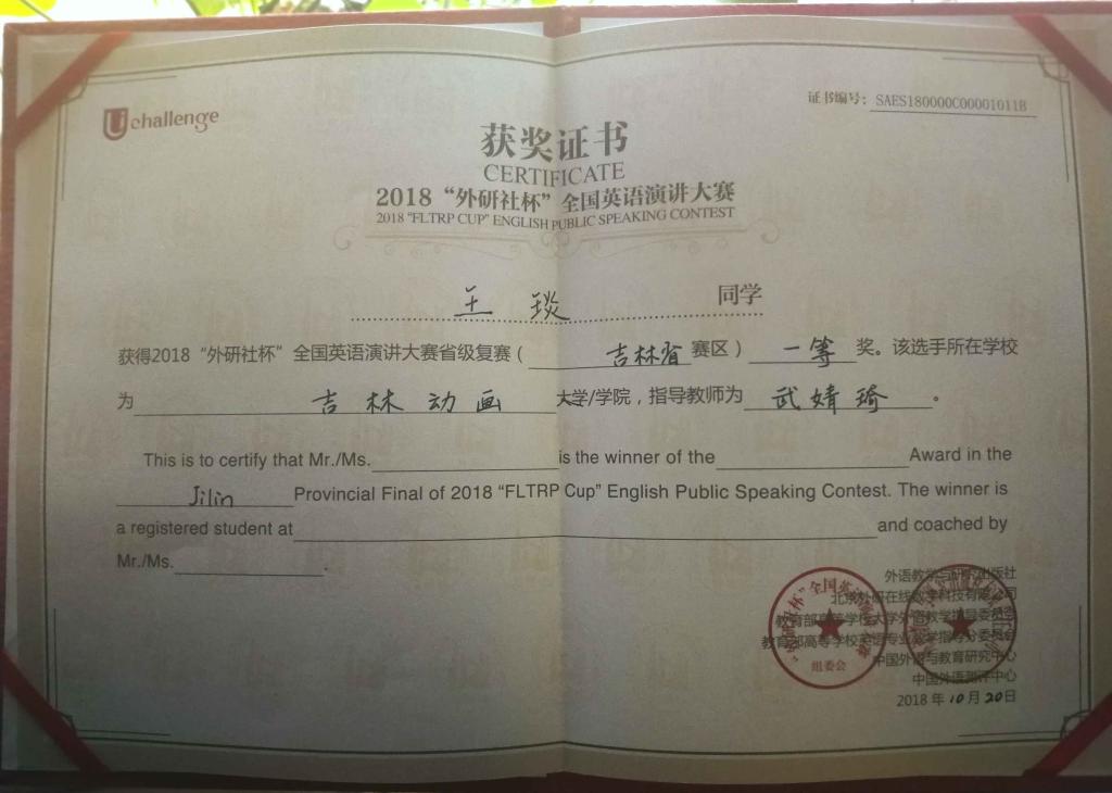 2018年10月20日,“外研社·国才杯”全国英语演讲大赛吉林省赛区复赛在东北师范大学人文学院隆重举行,由国际交流学院选送的万象城官网电影学院16级表演专业的王琰同学凭借精彩的表现在比赛中脱颖而出,荣获吉林省赛区一等奖。