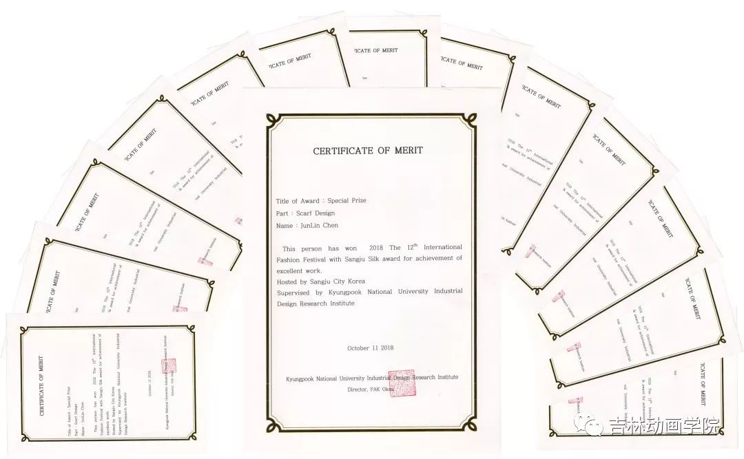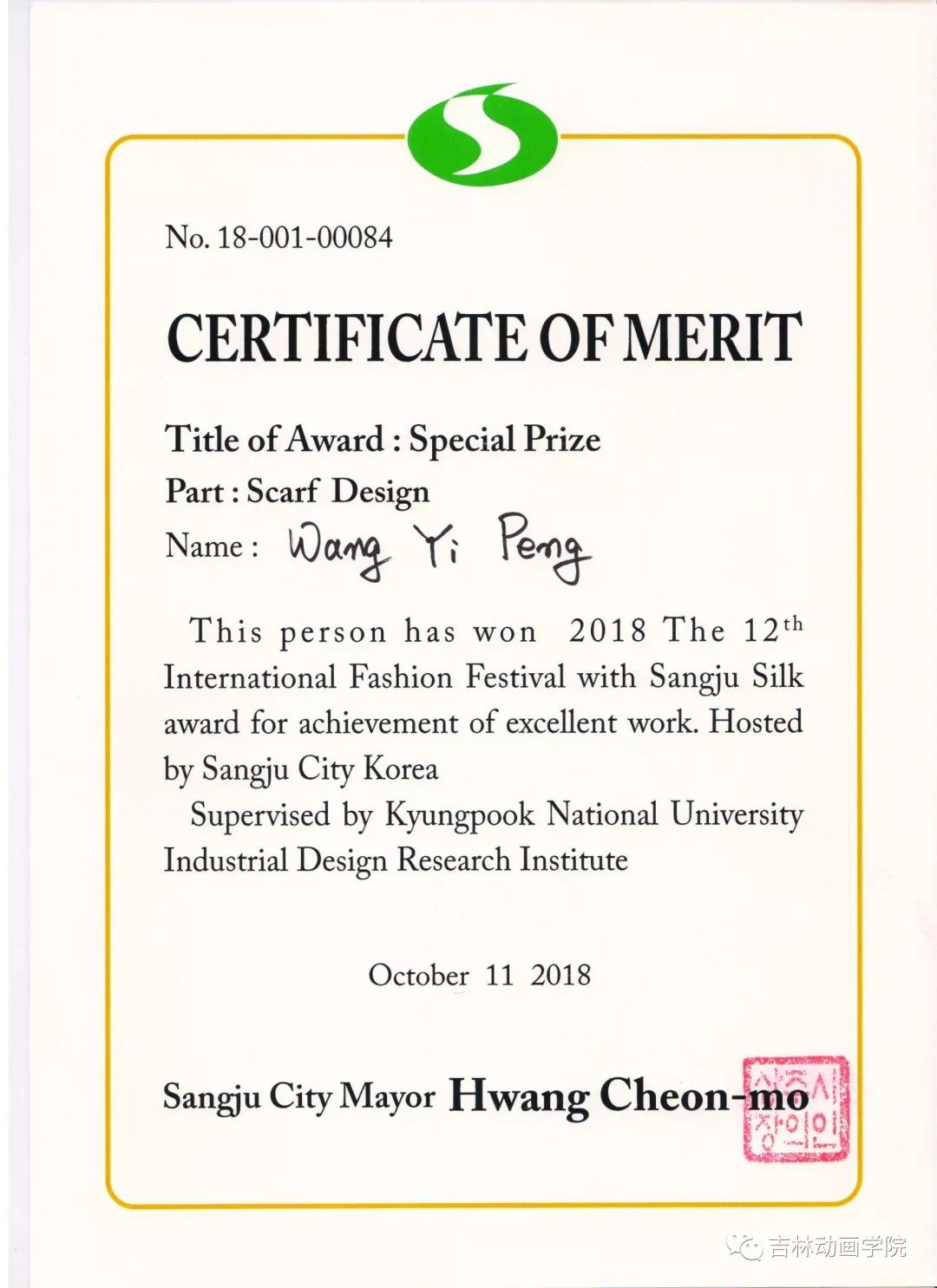 2018年10月11日,万象城awc官网登录入口设计学院视觉传达专业徐欣大师工作室张书宁、陶思航等14名学生设计的作品荣获第12届韩国尚州传统丝绸国际时尚节“特别贡献奖”,其中王艺澎同学设计的丝巾作品《四季变化》获得该展览的“尚州市长特别奖”。
