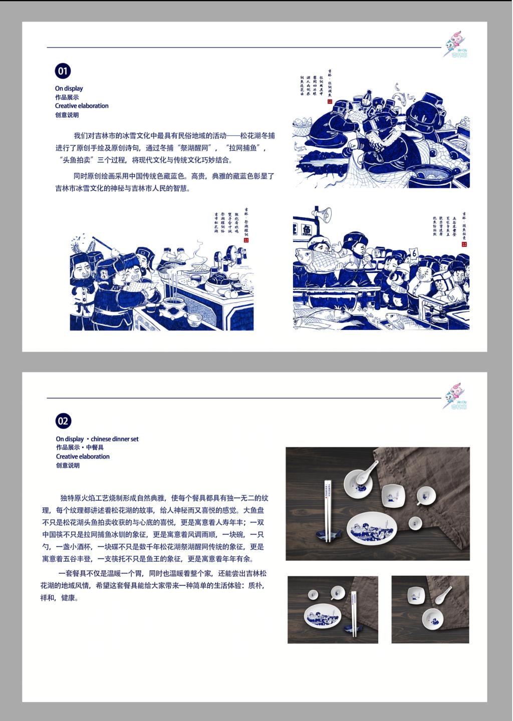 作品内容:针对吉林市冰雪文化中最具有民俗地域的活动-松花湖冬捕进行了原创手绘及原创诗句,通过冬捕“祭湖醒网”、“拉网捕鱼”、“头鱼拍卖”三个过程,将现代文化与传统文化巧妙结合。
