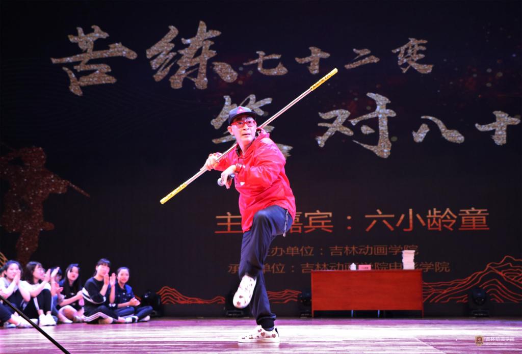 提问环节,章老师幽默风趣地回答了大家的问题,手把手传授金鸡独立等经典动作。伴随着《西游记》主题曲的播放,章老师挥舞着金箍棒,现场再现了美猴王孙悟空的身影。金箍棒在他手里灵活快速地旋转,美猴王的浩然正气和机智灵活展现得淋漓尽致,充分显示了表演艺术家的真正魅力,同学们直呼---大圣真的来了。