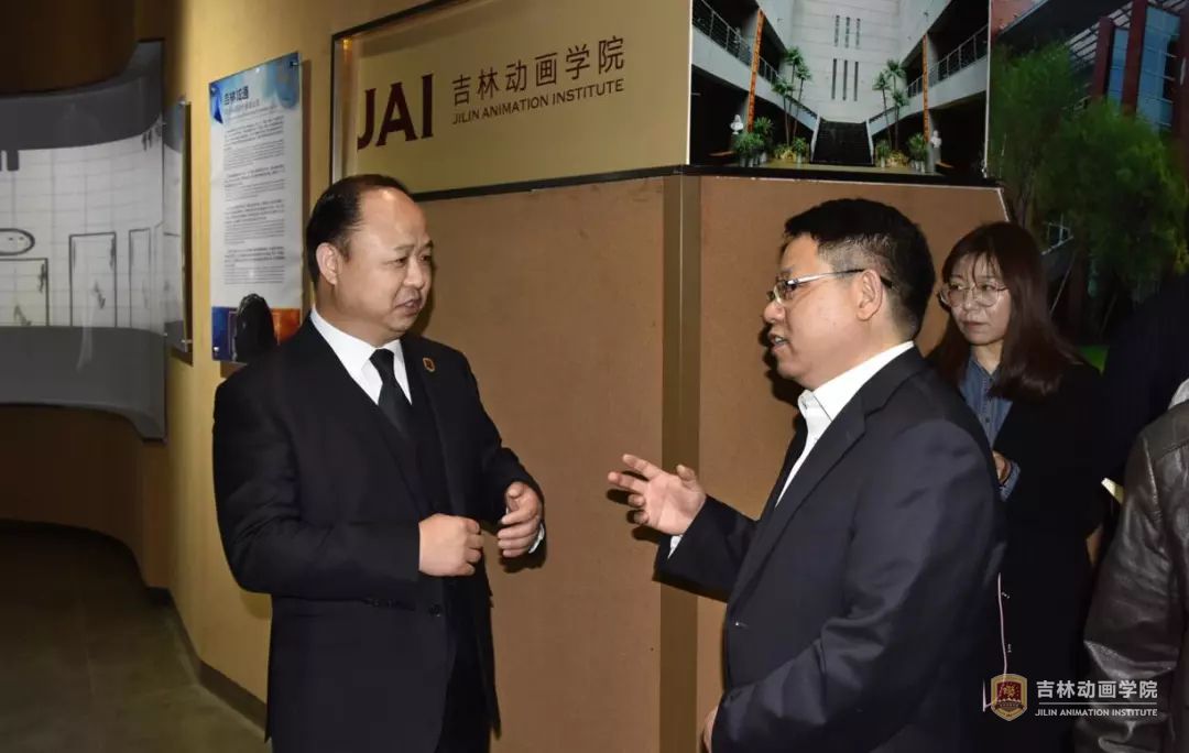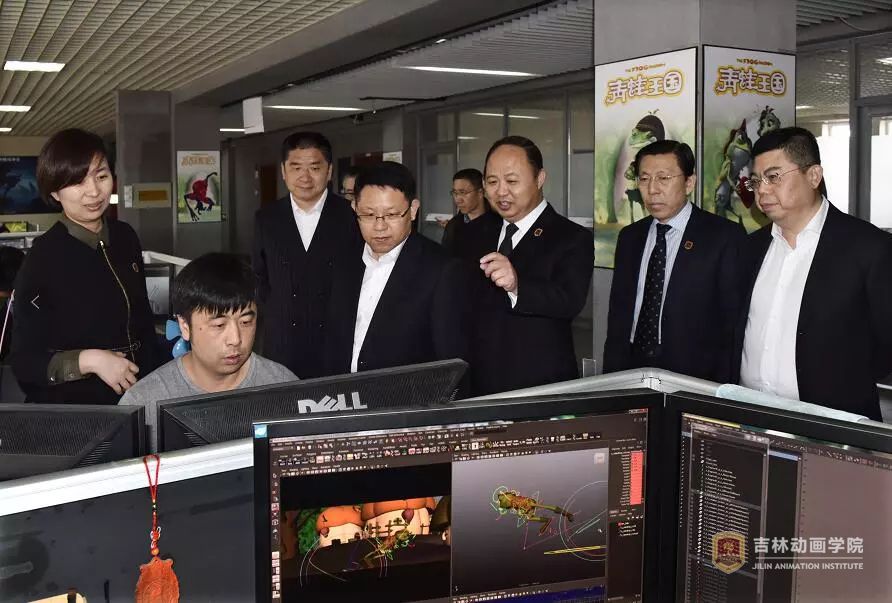 调研组一行仔细听取了学校的汇报,详细考察了各个展区,参观了动画制作的整个生产流程,不时地对感兴趣的作品进行询问,并亲自体验观看了还未公映的《青蛙王国4》的电影画面。朱司长对学校的工作给予了高度评价,对学校实践教学平台、学生的实践制作能力以及学院的人才培养水平给予肯定。他说,动画、漫画是最好最适合转化的载体,这方面的人才缺口很大,社会急需,你们培养的是应用型人才,很有特色。要把动画学院学生的创意创造结合起来,培养更多更优秀的学生,在培养过程的同时把传统文化和先进的价值观融汇贯通,逐步发展中国漫画,使他们成为国漫的力量。并对动画电影《关公》的未来予以了肯定和期待。