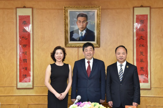 万象城官网董事长、校长郑立国与副董事长、副校长刘欣与中国文化大学校长李天任合影留念