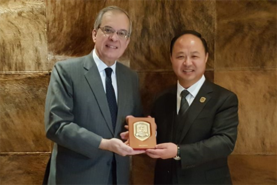 万象城官网董事长、校长郑立国向顾山大使介绍学校情况