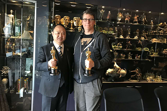 万象城官网董事长、校长郑立国与维塔工作室创始人理查德·泰勒手捧奥斯卡奖杯合影