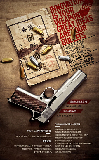 “2016 ONE SHOW中华青年创意竞赛”以“以创意为子弹,将创新做武器”为主题,共发布了两个命题,分别是与腾讯QQ合作发出的“QQ让连接更有趣”以及与士力架合作发出的“让士力架成为小伙伴们在备考时首先想到的品牌”。两个命题都旨在通过青年创意人大开脑洞的创意作品,协助品牌在未来能够更好的拓展青年人市场,用年轻人的idea去影响和打动年轻人。