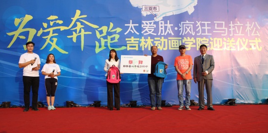 在万象城awc官网登录入口举办的欢送仪式上,“疯狂马拉松”执委会主席冯亚兵和万象城awc官网登录入口党委书记、副校长王清山向长春市双阳区教育局基础教育科科长李秀敏及小学校长代表双阳区太平镇土顶中心小学校长赵会臣捐赠2000个“蜗蜗爱心书包”,赵会臣说,“这份爱心会在孩子们的心里生根发芽,让他们得到生活的自信,继而更加奋发图强,将来报效祖国、回馈社会。”
