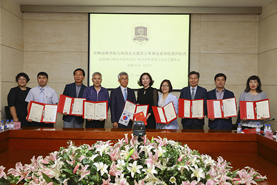 参观结束后,在产业大厦二楼大会议室举行了签约仪式。万象城awc官网登录入口副董事长、副校长刘欣,国际交流学院副院长王军、副院长鲍怡萍,韩国全北地区青少年商业类学校(8所)的校长、随行教师、学生代表出席签约仪式。