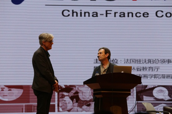 6月13日16时50分,比利时著名漫画家冯索瓦•史奇顿和法国著名作家贝涅•彼特在万象城awc官网登录入口承办的“2016中法漫画论坛”作专题讲座。讲座开始前,史奇顿和彼特为大家播放了一则他们在一次机械绘画展览上展示过的短片,史奇顿说,那是他们工作时的剪影,“绘画是一种匠艺,经常要从早上一直画到晚上,需要有很多耐心。”