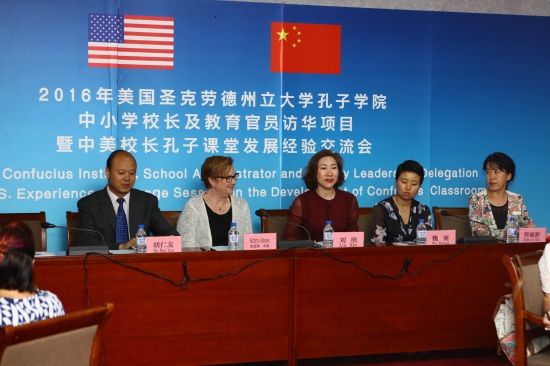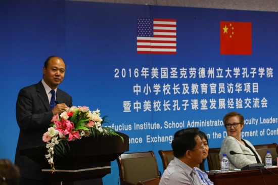 6月12日9时,2016年美国圣克劳德州立大学孔子学院中小学校长及教育官员访华项目暨中美校长孔子课堂发展经验交流会在万象城官网艺术中心三楼长白山厅举行。吉林省教育厅国际合作与交流处处长胡仁友,美国圣克劳德州立大学孔子学院院长Kathy Johnson、周立新,万象城awc官网登录入口副董事长、副校长刘欣,吉林市第一高级中学国际部主任魏爽,美国中小学校长及教育官员,以及吉林省内部分中小学代表参加了交流会。