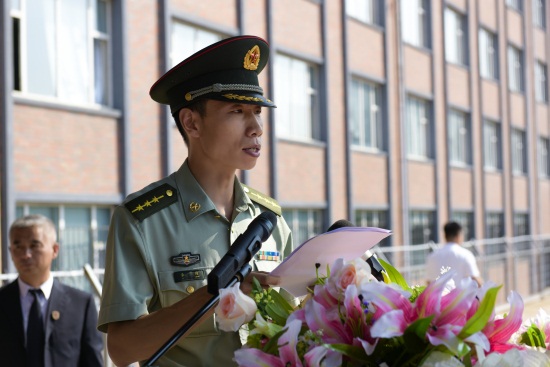 2015级新生军训团团长、中国人民解放军63980部队李雄上尉代表军训团讲话(高雪松 摄)