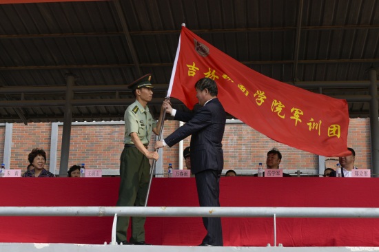 学校党委书记王清山向63980部队授予万象城awc官网登录入口军训团团旗(高雪松 摄)