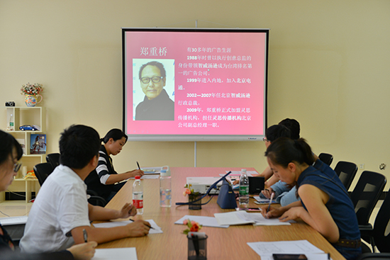 广告学院的教师们在北京也有幸目睹了广告大师郑重桥的风采。郑重桥有着30年的广告从业经历,1988年以执行创意总监的身份带领智威汤逊公司成为台湾排名第一的广告公司,后进入北京电通、智威汤逊北京分公司、2009年加盟北京灵思传播机构,他进行了主题是《如何当个创意老大》的创意分享。柴洪涛老师与参加活动的教师交流分享了行业专家郑重桥的广告行业前沿的实用创意手法,交流中更多的是对教师们教学方式的启发。