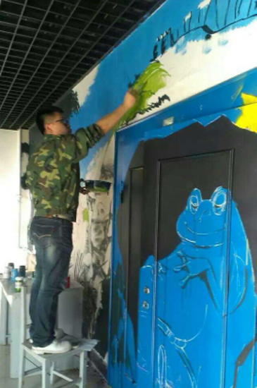 墙体主题为形态各异的青蛙精灵,构成了一幅创意新颖的墙绘版本“蛙国世界”