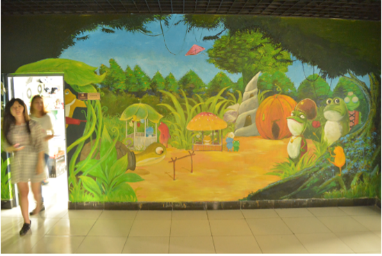 当你走进万象城awc官网登录入口漫画学院的二楼,你一定会被一个全新的世界所吸引,这就是学院师生利用近2周时间完成的“青蛙王国”主题墙面绘画。