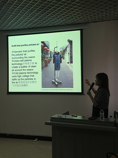 6月16日9时,“服装设计的表现与应用”系列专题讲座在设计学院B526(3)教室正式开始。整个教室座无虚席,每个学生都期待着听到刘老师给他们带来的不一样的服装专业知识。聆听此次讲座的有设计学院徐欣院长、服装与服饰设计系曲媛主任及服装与服饰设计系所有教师。整场讲座围绕着“新型面料”、“功能性服装”、“科技在设计中的应用”、“环保及循环利用的概念在服装中的应用”这四大方面展开,刘老师中英文结合、高清晰图片展示、时尚前沿内容的阐述充满整个课件,给学生们很大的鼓舞和启发,告诉他们现如今的服装市场在流行什么、需要什么样的人才、如何去做与众不同的设计以及学好英语的重要性。刘老师的讲座内容,大大的开拓了学生们的视野,让他们知道了中国以外的服装市场是什么样的,也提供给他们很多设计新思路。学生们听的认真起劲,拍照、做笔记,讲座结束后,有很多学生向刘老师单独提问,刘老师都耐心的一一为他们解答。