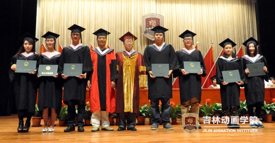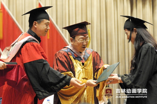 学院院长于庚蒲与动漫分院院长武立杰为获学士学位的学生颁发证书
